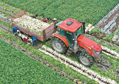 春节临近,四川省南充市蓬安县当地农民抢抓销售旺季,做好萝卜、青菜、花菜等蔬菜的采收、销售,保证节日市场供应。图为菜农们在蓬安县锦屏镇中坝社区万亩蔬菜种植基地忙着采收萝卜。